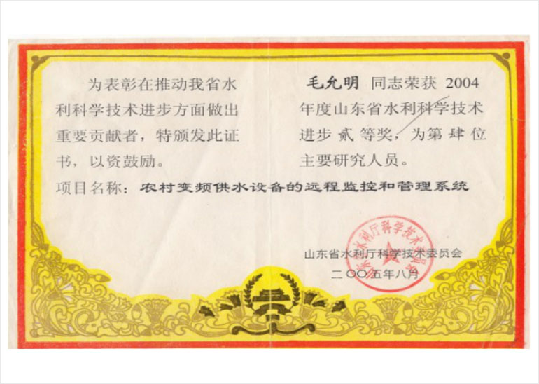 在“依科技創(chuàng)新發(fā)展”的理念引導(dǎo)下,為進(jìn)一步提高農(nóng)村變頻供水系統(tǒng)的科技含量,完善農(nóng)村供水管理和服務(wù)體系,公司研發(fā)了多項相關(guān)技術(shù),其中“農(nóng)村變頻供水設(shè)備的遠(yuǎn)程監(jiān)控和管理系統(tǒng)”及“供水自動化智能控制與全數(shù)字動態(tài)顯示系統(tǒng)的研究”獲得了山東省水利廳科學(xué)技術(shù)進(jìn)步獎。