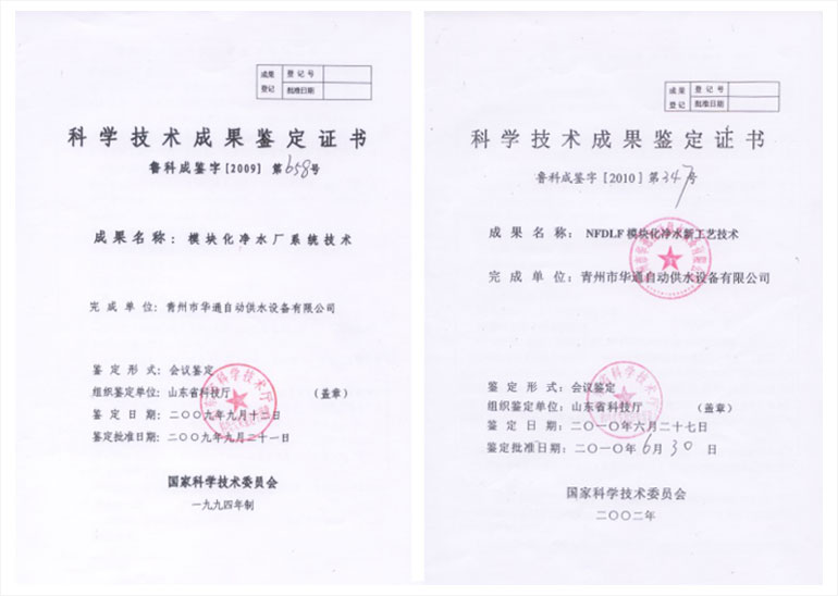 公司自主研發(fā)的“模塊化凈水廠系統(tǒng)技術(shù)”及“NFDLF模塊化凈水新工藝技術(shù)”通過技術(shù)鑒定,其中“模塊化凈水廠系統(tǒng)技術(shù)”的集成技術(shù)及“NFDLF模塊化凈水新工藝技術(shù)”的清水集流系統(tǒng)技術(shù)、斜管沉淀工藝的即時轉(zhuǎn)換技術(shù)、出水控制系統(tǒng)及獨立反沖洗系統(tǒng)技術(shù)均達(dá)到國際領(lǐng)先水平;