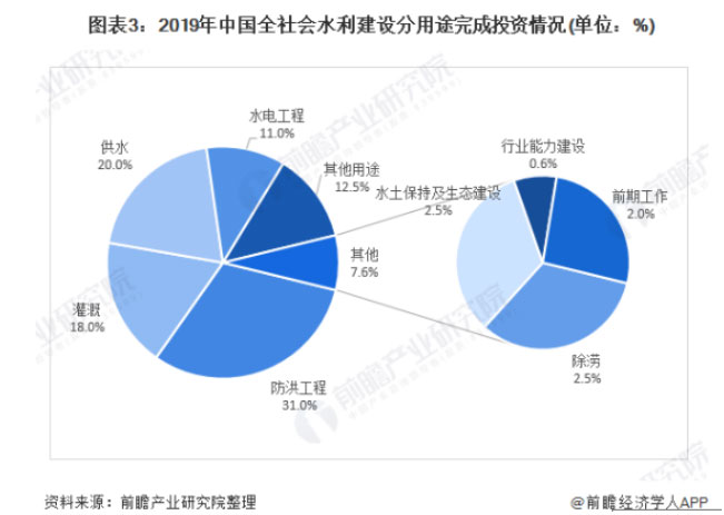 我國(guó)水利建設(shè)投資資金主要應(yīng)用于防洪工程、水資源工程、水土保持及生態(tài)建設(shè)、水電工程、行業(yè)能力建設(shè)、前期工作及其他這七個(gè)方面。在2019年全年完成投資中,防洪工程建設(shè)完成投資2251億元,占比31%;灌溉完成投資1307億元,占比18%;除澇完成投資182億元,占比2.5%;供水完成投資1452億元,占比20%;水電工程完成投資182億元,占比2.5%;水保及生態(tài)建設(shè)完成投資799億元,占比11%。