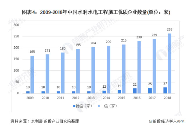 2009-2018年,中國(guó)水利水電工程施工優(yōu)質(zhì)企業(yè)數(shù)量整體呈現(xiàn)增長(zhǎng)態(tài)勢(shì)。截至2018年年底,全國(guó)共有水利水電工程施工總承包特級(jí)資質(zhì)企業(yè)27家,同比增長(zhǎng)8%;水利水電工程施工總承包一級(jí)資質(zhì)企業(yè)263家,同比增長(zhǎng)1.04%。